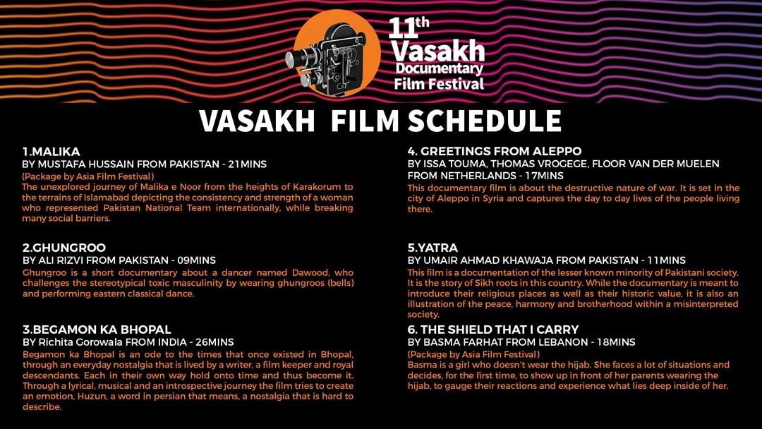 Vasakh Film Festival showcases local and foreign documentary films on themes including but not limited to themes such as human rights, equal citizenship, gender equality and religious tolerance. It also provides an opportunity to the aspiring documentary filmmakers to exclusively showcase their work, and network with their contemporary filmmakers from around the world.